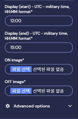 만약에 Display(start)에 '시간:분' 을 적어두면 해당시간에 설정한 이미지 등이 나타납니다.