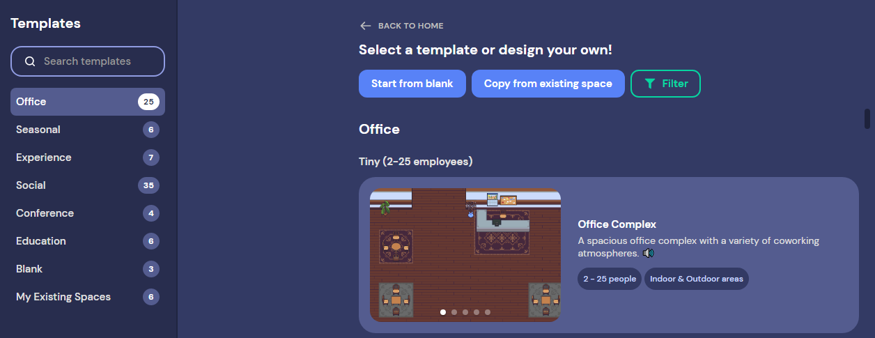 제일 쉬운 방법은 게더타운에서 제공하는 템플릿을 선택하는 방법으로, 하나만 예시로 만들어보겠습니다.