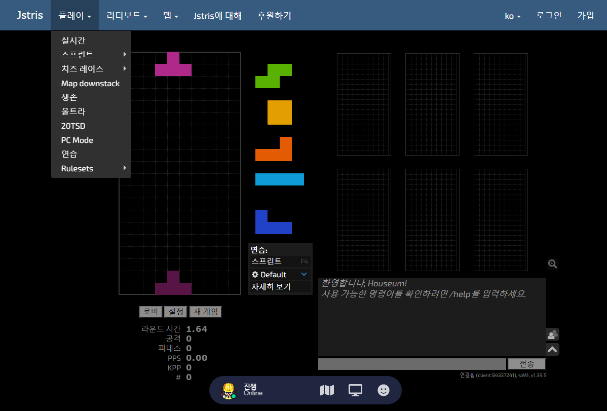 혼자 연습할 수도 있고 '실시간'을 눌러 전세계의 게더타운 유저들과 대결할 수도 있습니다.