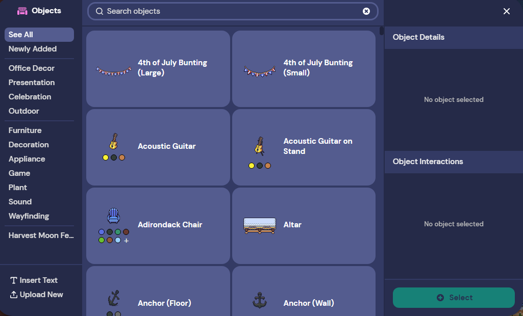 빌드 > Open object picker를 누르면 게더타운에서 제공하는 오브젝트들을 설치할 수 있습니다.